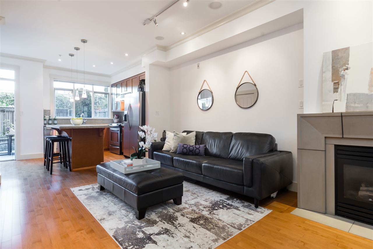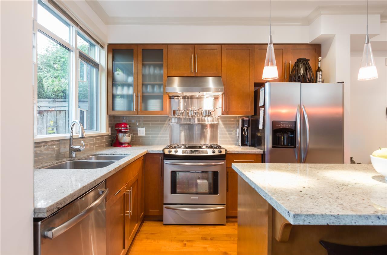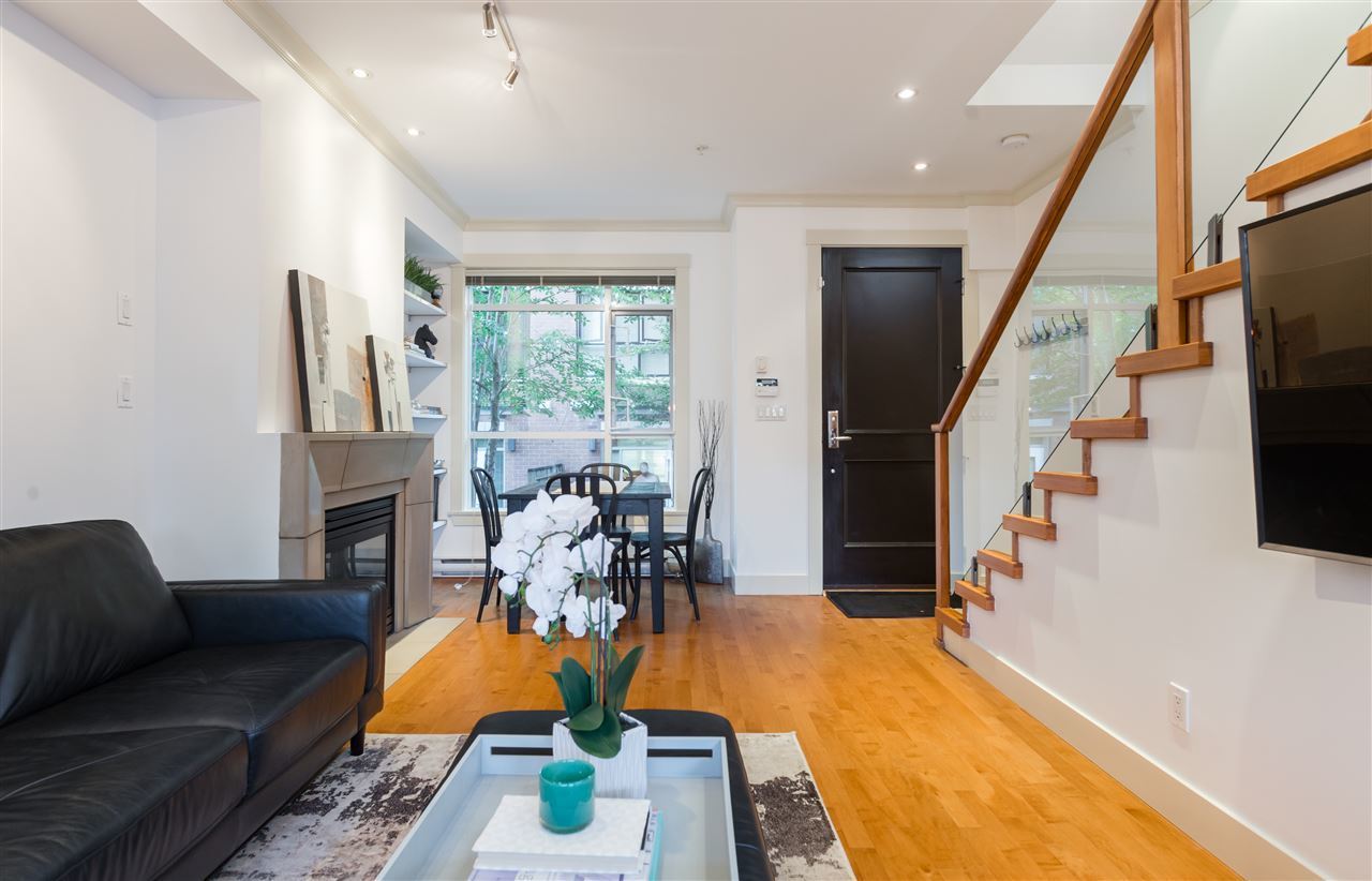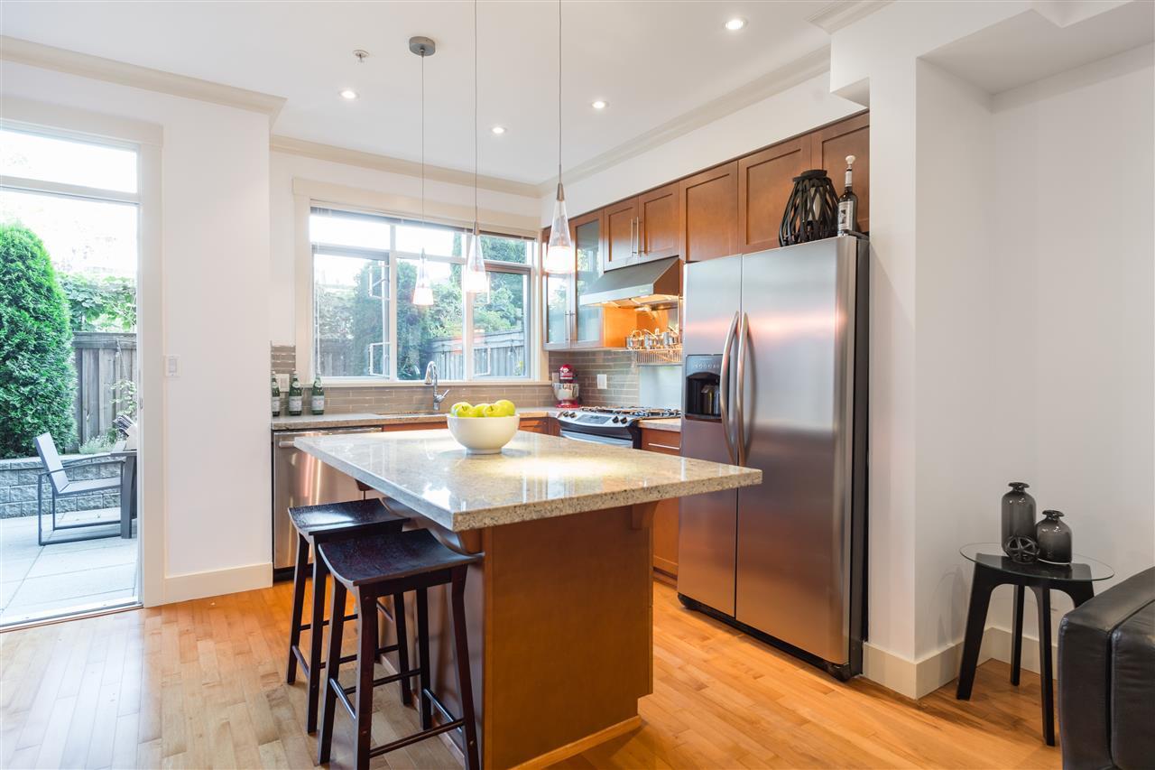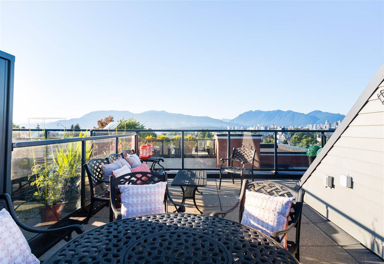 OUTSTANDING VALUE. ONE-OF-A-KIND. The Edge on Fifth. A Boutique Collection of Manhattan style T/H's in the heart of Kits; SPECTACULAR Water, City + Mountain views from your private rooftop deck! This spacious 3 bed + den plan is built with upscale finishings including modern open concept kitchen with S/S appl's, gas range & stone counters. Enjoy the airy over-height ceilings, gas fireplace and engineered h/w throughout the main floor. This RARE home features over 500 SF of O/D spaces; Large south facing patio off the kitchen backs onto private community gardens. 400 SF ROOFTOP DECK w/gas hookups and PANORAMIC views is perfect for entertaining. The location is truly ONE-OF-A-KIND, just steps away from boutique shops and the revered restaurants on West 4th.
