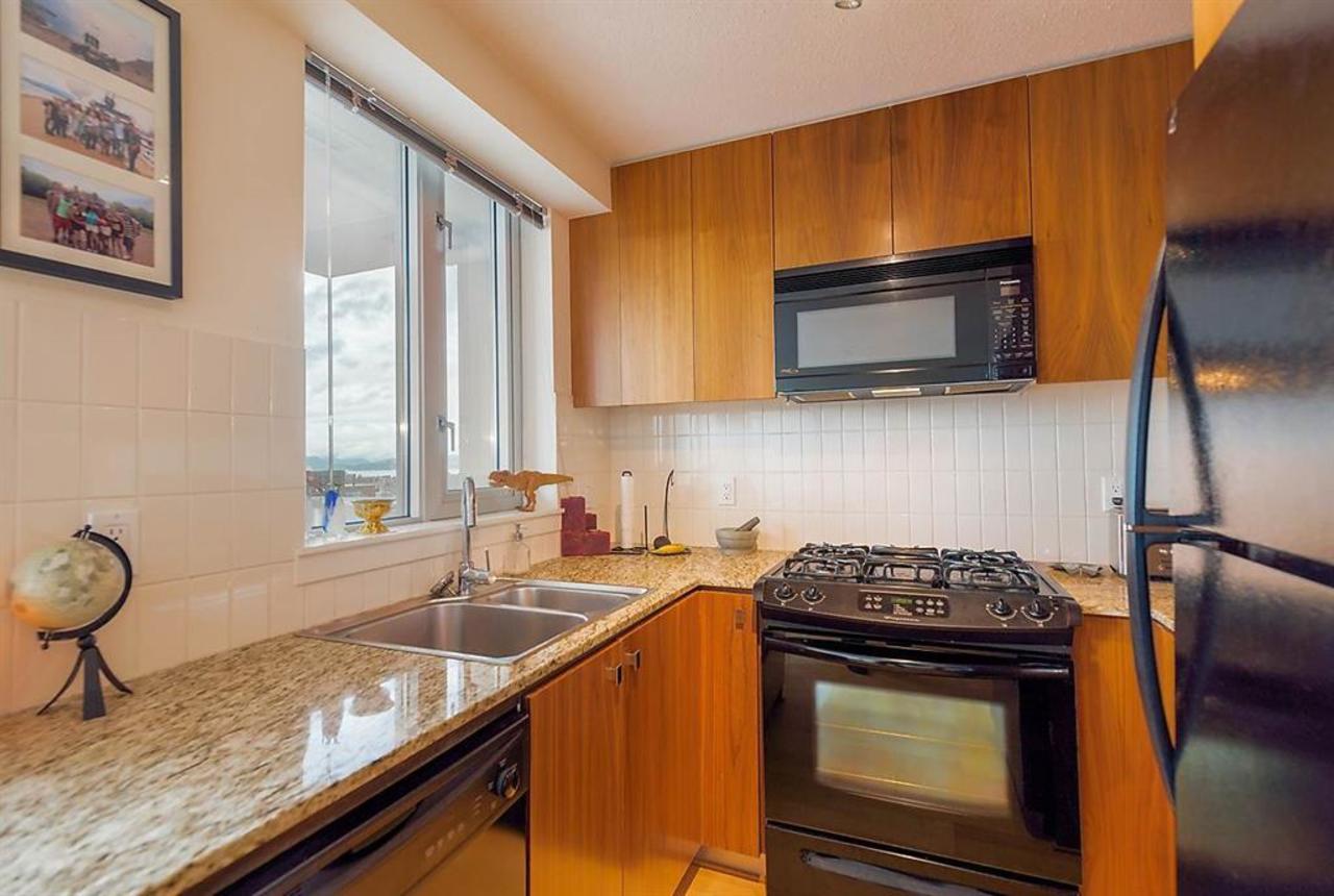 Fabulous, bright south, west and north facing corner suite. Quiet south facing bedroom. Lovely English Bay, mountain and city view to the north. Most spacious layout, with open living area, even a window in your kitchen with views and large open balcony. Engineered hardwood floors, granite counters, and gas cooking. Custom built in office by California closet in flex/den space. Fantastic location, near cafes, restaurants, shopping, and seawall. Walk score 97! 84 transit score! Minutes to downtown and UBC. One secured parking, visitor parking and common fitness room.