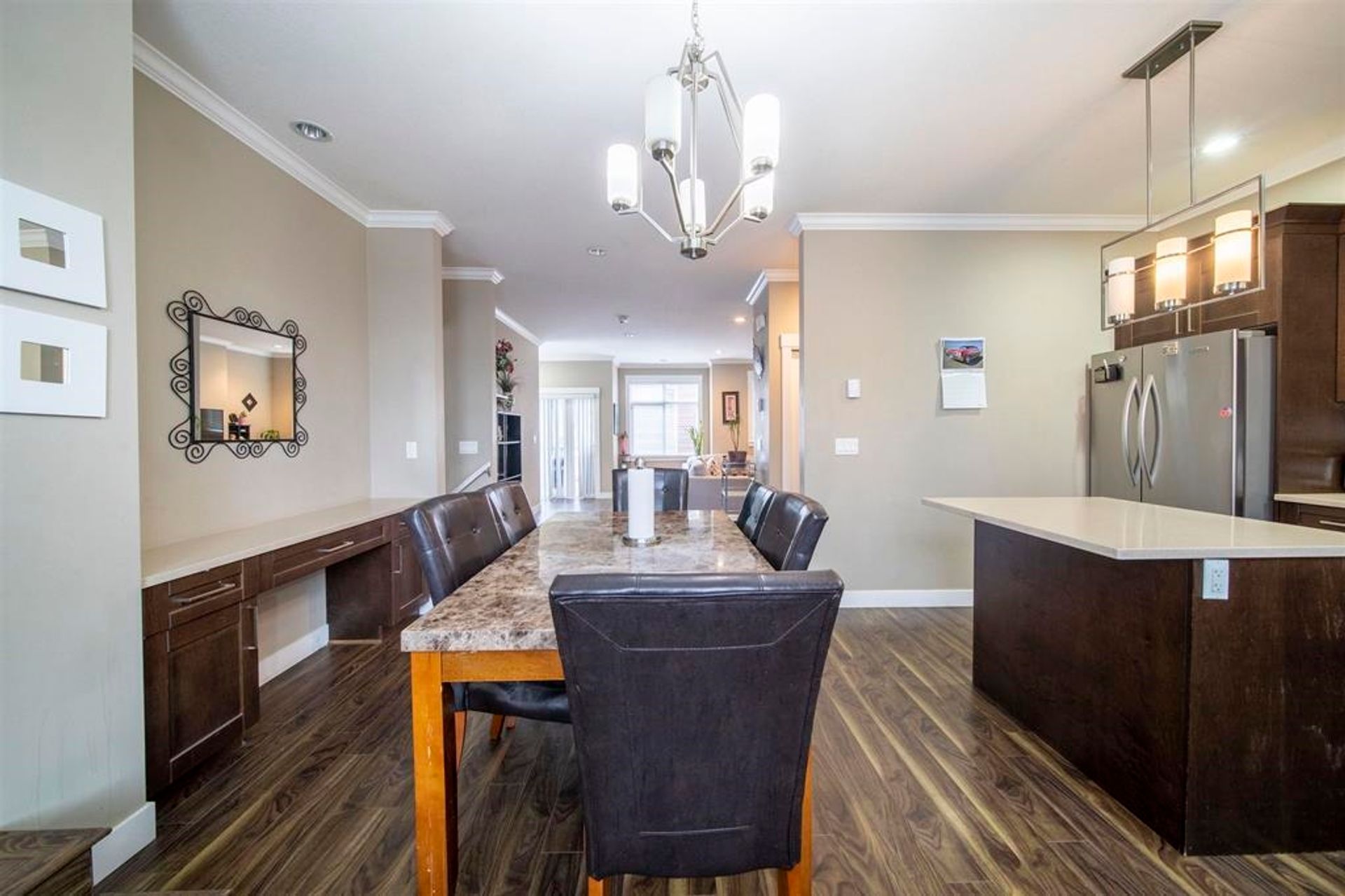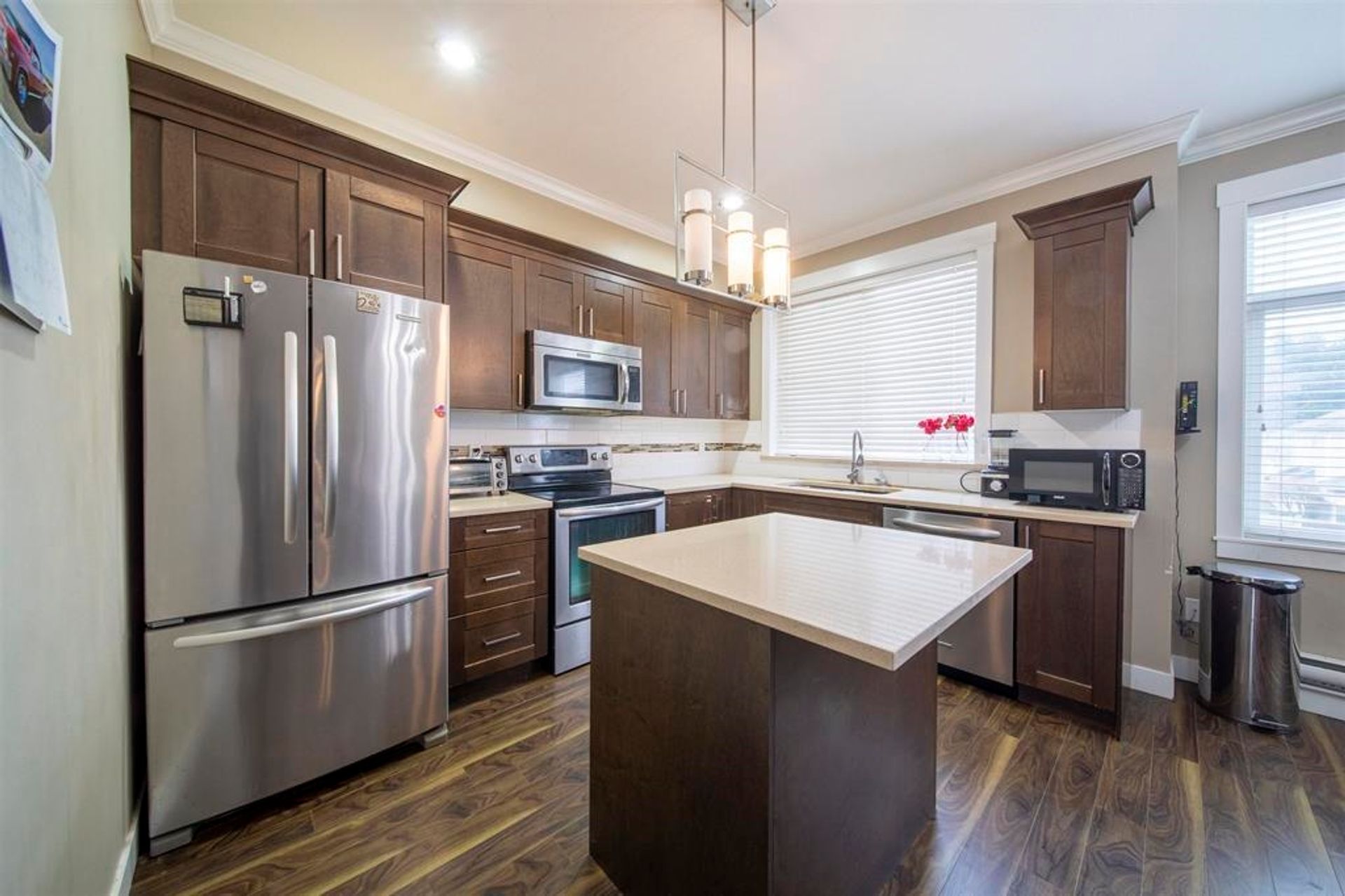 Grand Heights townhouses!!!! Very private location, 21 town homes, 4 bedrooms, side by side double garage. Great plans, 9' ceiling, on main floor, facing east, south and west with lots of natural lights. Plenty of extra street parking for guests & convenient front door access. Quartz countertops, crown mouldings, Maytag stainless steel appliances, bigger backyards, close to bus services, sky train. Private bedroom & bath on lower level is ideal for teens & in-laws, can be mortgage helper with separate entrance. Home is ready to view. Corner unit.